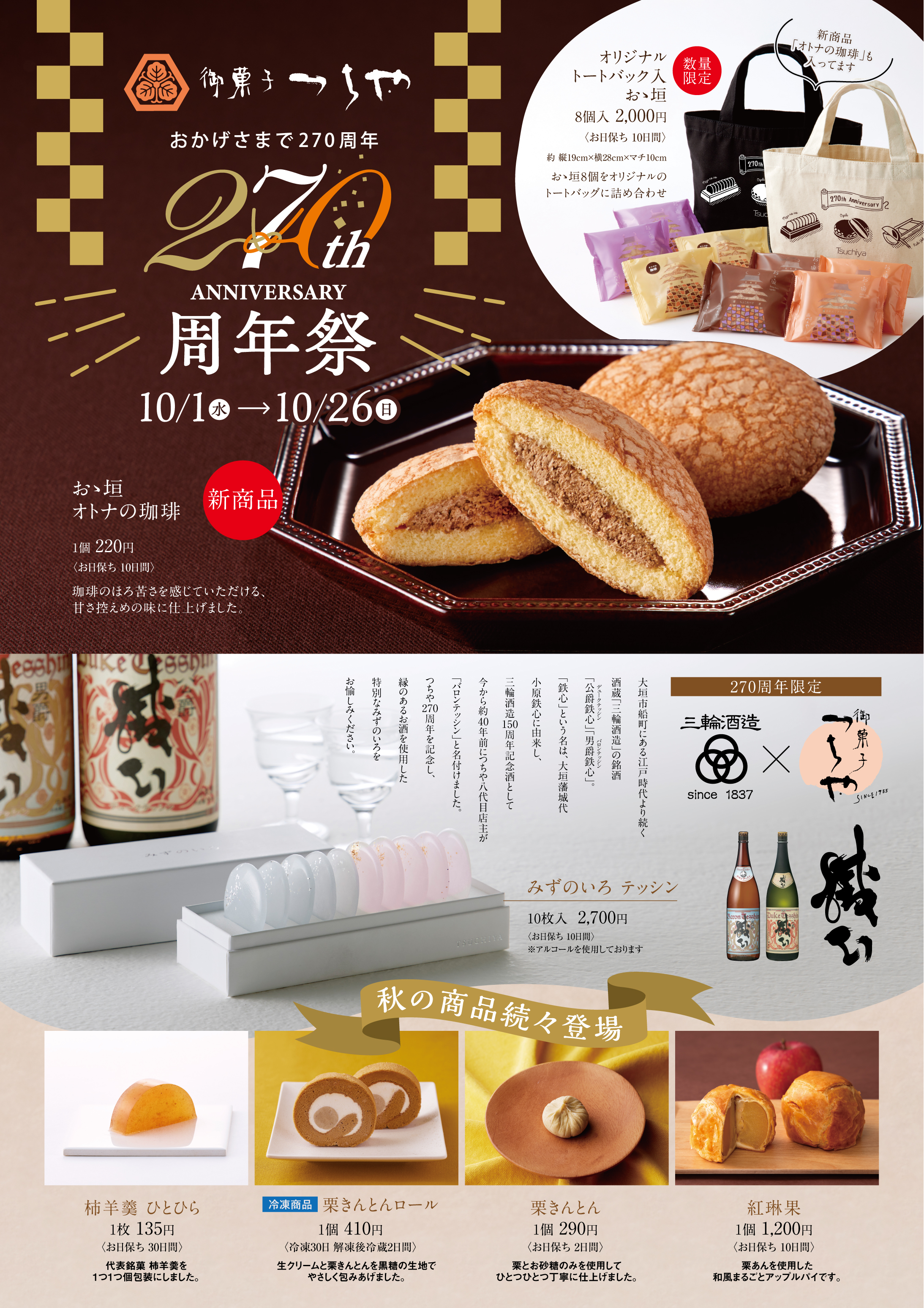つちやは1755年創業、2025年に270周年を迎えた老舗和菓子屋です。この度10月1日(水)より創業270年を記念した創業祭を開催いたします。周年祭では、1959年に日本で初めて発売されたクリームサンドブッセ「おゝ垣」、2016年発売の四季の景色を水のひとしずくに見立てた「みずのいろ」の新商品を販売いたします。また、10月の週末はつちや各店舗でお得なお菓子セットの販売やイベントを実施いたします。お近くにお越しの際はぜひお立ち寄りくださいませ。